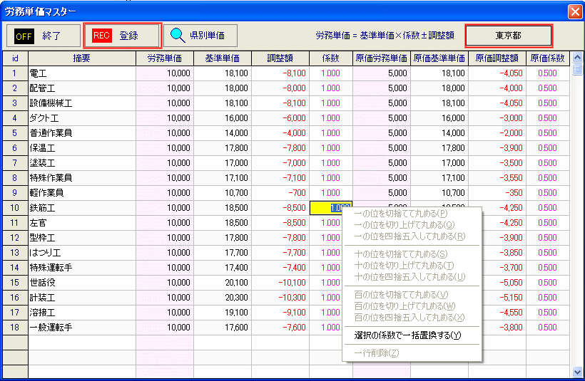 労務単価の調整は「調整金額」と「係数」で調整してください。